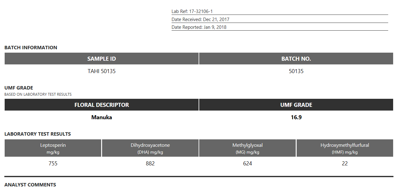 Tahi Manuka Honey UMF 15 Batch 50135 |